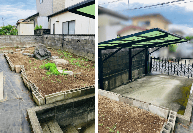 雑草がほとんどない庭と、今も使われているような佇まいのカーポート