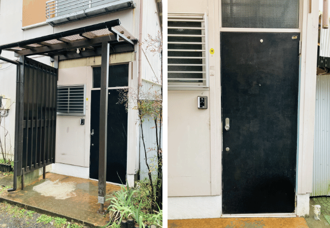 雨粒が黒い玄関扉を濡らし、どこか寂しさを感じさせます。